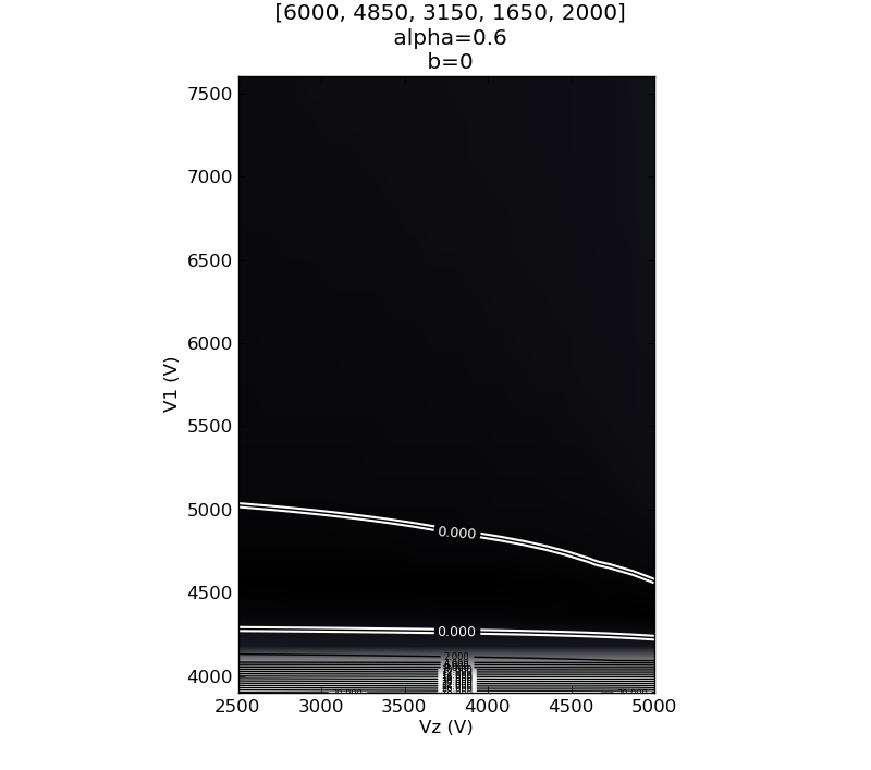 Theoretically, the radial motion is stable if delta is lower than 1. So with this setup, there will be no trapping. In order to find a good configuration of the potential, we fix V2, V3 and V4 and vary V1 and Vz. This can be represented in a stability map. The Zgraph class enables you to plot the stability map of your setup. It is parallelized using multiprocessing. For example, with the same ion at a lower energy, 4.2keV:
